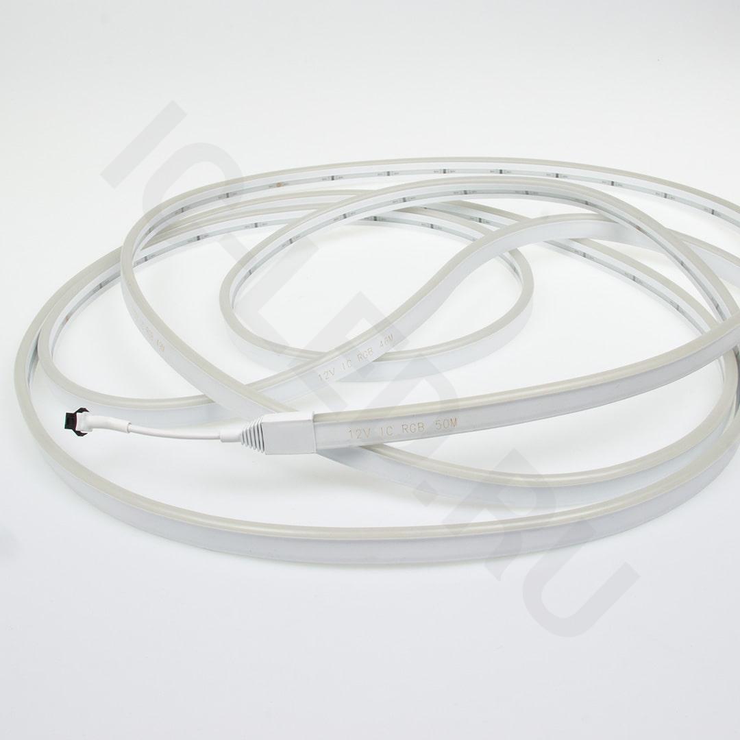 Светодиодный гибкий неон. Цвет свечения RGB (640/525/460 nm), угол свечения 120 градусов. Тип светодиода 3838 72 шт/м. Управление по сигналу SPI. На отрезке 1000 мм расположено 24 модуля с шагом нарезки 41.6 мм. Напряжение 12 V, мощность 12 W/m, размеры 1000х6,5х16,5 мм. Класс защиты IP65. В катушке 50 м (подключать не более 5 м последовательно). Вес катушки 5 кг. Норма отпуска от 1000 мм. Светодиодный гибкий неон 12 V наиболее востребован в освещении, в качестве контурной подсветки, создании свето-динамических сценариев освещения, а также в авто-мото тюнинге. Низковольтное питание неона безопасно при использовании во влажных помещениях и на улице.